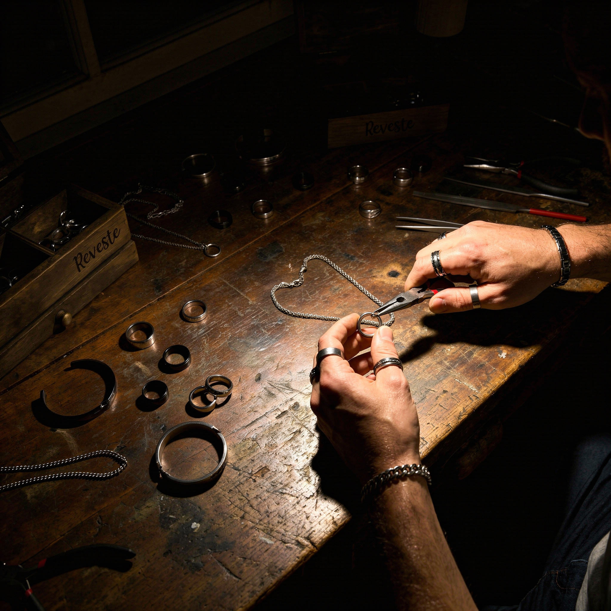 Hoje, a Reveste se inspira naquilo que atravessa o tempo: o peso da madeira, a força do metal, a memória do couro e a origem das pedras naturais. Nossos acessórios são produzidos majoritariamente em aço inox, escolhidos pela sua durabilidade e resistência. Também utilizamos couro sintético de alta qualidade, uma escolha consciente e responsável, além de permitir um controle rigoroso de padrão e acabamento. O couro sintético garante resistência ao uso diário, mantém sua forma ao longo do tempo e está alinhado a uma visão de produção mais acessível e ética.